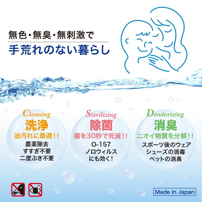 成分の99.9%が水。純水をベースに食塩(NaCl)を使用しない電解技術で生成された強アルカリ電解水にウルトラファインバブルをプラス。水だから人と環境にやさしく、ご家庭から業務用まで安心してご使用いただけます。